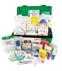 A collection of equipment for the initial treatment of minor to moderate injuries.